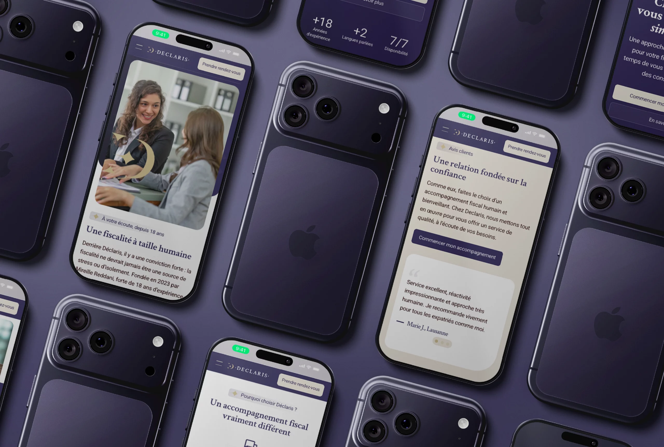 Les cartes de visite, validées immédiatement, sont venues compléter le dispositif en apportant une continuité entre supports digitaux et imprimés. Créer une image forte dans le domaine fiscal n’est pas un exercice évident : le risque est de tomber dans le trop austère, ou au contraire dans le trop léger. Notre défi était de trouver l’équilibre parfait, en donnant à Déclaris une identité qui inspire à la fois confiance et proximité. Résultat : une marque solide, professionnelle et humaine, capable de séduire et rassurer une clientèle internationale exigeante.