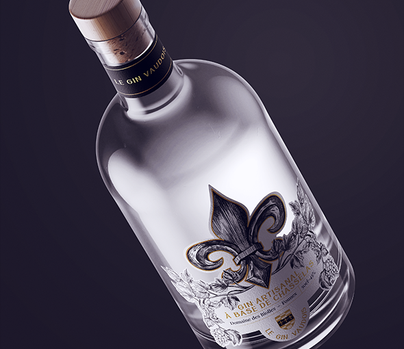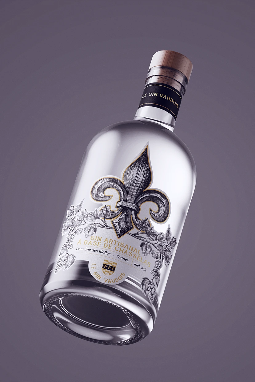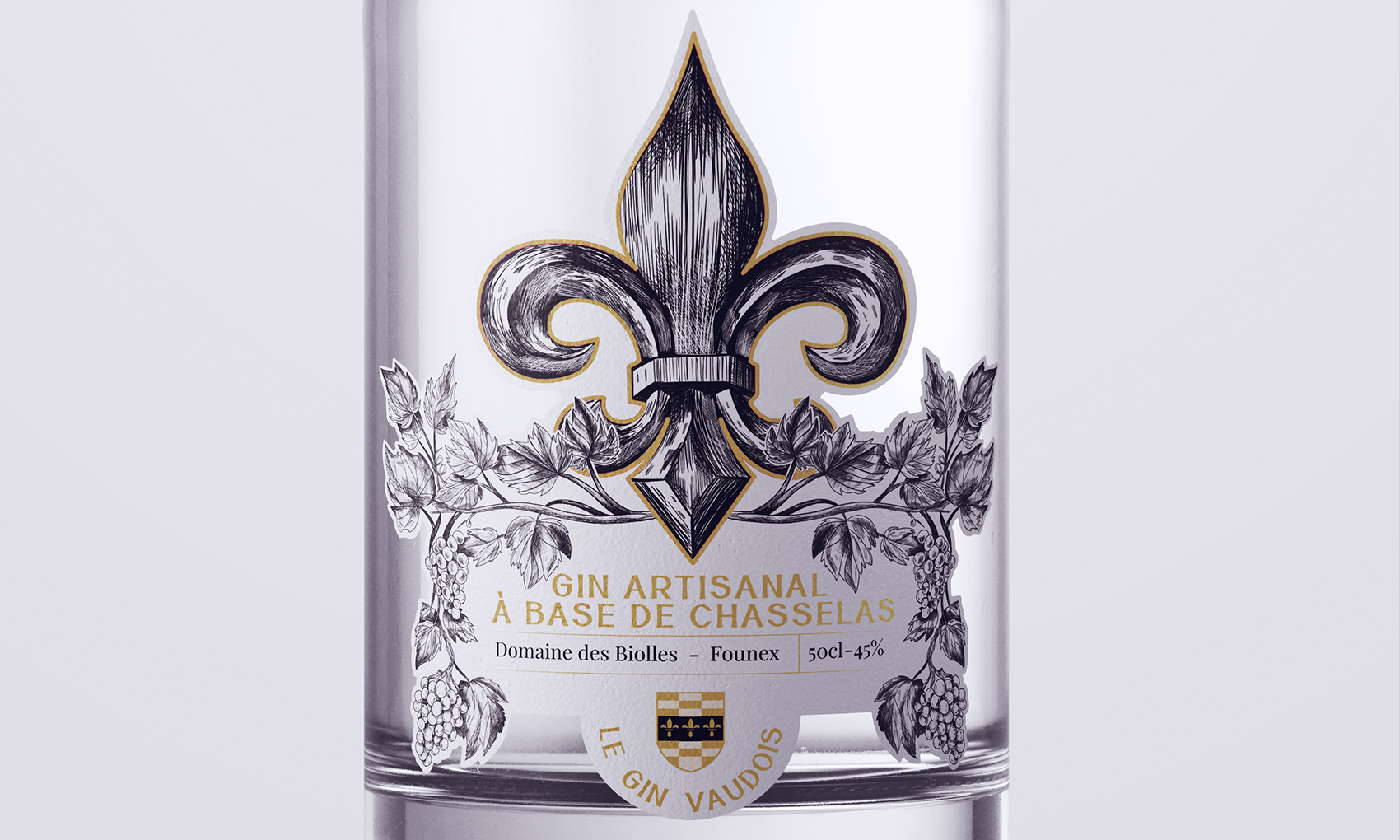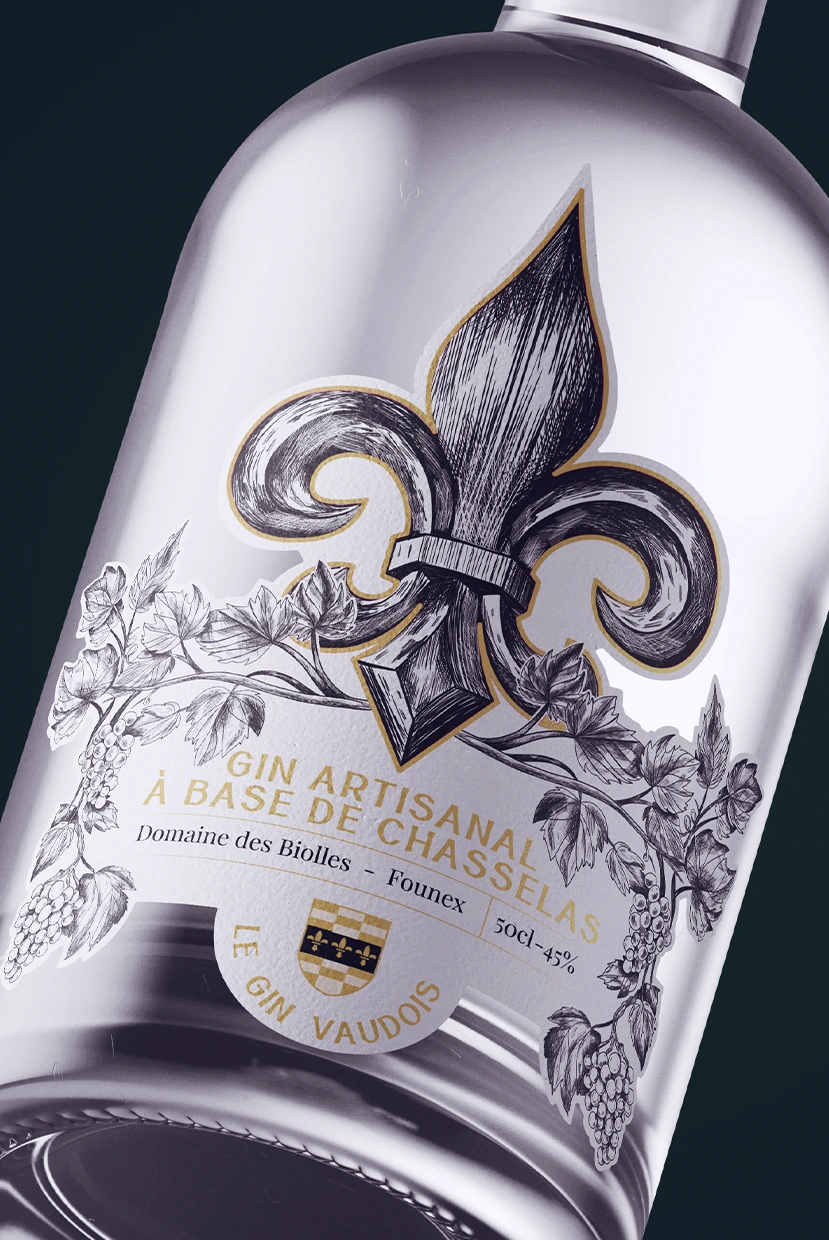 Quand le client nous a confié la création de l’étiquette pour son Gin à base de Chasselas, il avait une demande claire : intégrer la fleur de lys, symbole de son blason familial. Pour le reste, carte blanche. Plutôt que de suivre les codes classiques, nous avons imaginé une étiquette en forme de lys pour surprendre, en y ajoutant une feuille de vigne pour rappeler le terroir du Chasselas.